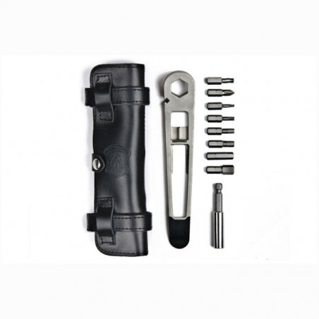 Sa conception unique permet même à l'outil de se transformer en poignée, ce qui vous donne plus d'effet de levier que n'importe quel autre outil multifonctionnel pour vélo sur le marché. L'outil est livré avec une variété d'embouts hexagonaux, de têtes de tournevis et un prolongateur d'embout magnétique. Chaque Nutter est également livré avec un étui en cuir de première qualité et en chambre à air recyclée. Vous pouvez choisir entre un cuir brun brûlé ou noir de jais pour la pochette.